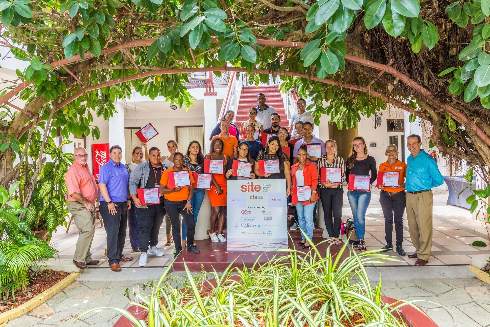 CIS Class Graduation in Aruba. Far left, two sponsors: Professor from University of Aruba, and Maoreen Every from ECO DMC, the students in the middle and then Jim at far right.